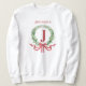 This Christmas sweatshirt has a preppy grandmillennial design featuring a Christmas wreath with a monogram letter in the centre. You can personalise with your initial and name.