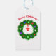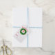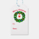 Gift tag with my design of a holiday wreath decorated with blue, green, red, white and purple hearts with a big red heart hanging from a red ribbon.