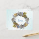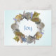 Tropical themed seashell wreath Christmas holiday greeting postcard. Affordable holiday card with customisable text with a message and signature on the back. Light blue background and pretty beach shells surrounding the text 'joy' on front.