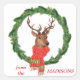 Here's a fun sticker that would look great on your Christmas card envelopes, or for many other Holiday uses. It shows a watercolor image of a reindeer wearing a bright red and green scarf. The reindeer is framed by a green Holiday wreath. Your custom text is in red in two text fields at the bottom. The image and text are placed on a white background. If you need to change the font, colour, or size of the text, use Customise.
