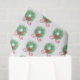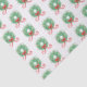 This holiday tissue paper features a pattern of Christmas wreaths with green leaves, red berries and red bows.