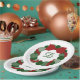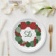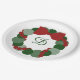 Add a special touch to your Christmas festivities with paper plates featuring a geometric Christmas wreath with a customisable monogram in the centre. The wreath in this original digital design is made of green dots in three different shades and sizes. A strand of smaller red dots reminiscent of cranberries winds around the circular pattern. The image is topped with a red bow.