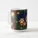 Realistic festive Christmas wreath made of evergreen pine branches with red berries golden baubles and soft glowing lights framing a tiny village of winter houses. Hand painted raster digital illustration on a snowy dark blue background