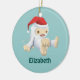 A christmas ornament with an illustration of a cute little Christmas yeti, toy doll, wearing a red santa hat. The little yeti has a pull string to make him talk and he is covered in soft white fur with light brown accents. Background is a retro green colour. Personalise / customise with a name.