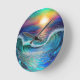 Invite the calm of the sea into your home with this surreal seascape piece, where a beautiful blend of blue hues and opal and jade colored waves meet the warmth of a dreamy sunset.