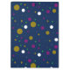 A pattern of variously sized circles in gold, white, purple, and green is scattered across a dark blue background. The circles are evenly spaced and vary in diameter.