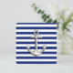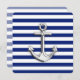 A silver chrome like anchor applique on a horizontal navy blue style stripes print decor for a perfect nautical look.