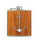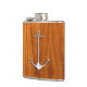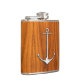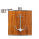 A modern nautical style silver chrome like applique on a teak wood print decor for a fine custom flask gift.