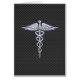 The Symbolic Silver Chrome Like Caduceus Medical Symbol design presented here on a black carbon fibre print decor. The caduceus snakes is designed to look like it is made of chrome. Good for a graduation occasion, a statement for your profession, or for a gift with that medical look your are looking for.