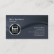 This simple elegant and professional accountant business card features a black background. A black hued wave streams from the left to the right, splitting the card into two sections. A circular chrome calculator icon sits on this wave, on the left side of the card, while your name and title appear on the upper left and your business name and contact details appear on the bottom right. Designed for businesses or professions related to transport, administration, management, professional, accounting, finance, financial, general themes.