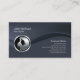 This simple elegant and professional hair stylist business card features a black background. A black hued wave streams from the left to the right, splitting the card into two sections. A circular chrome hair style icon sits on this wave, on the left side of the card, while your name and title appear on the upper left and your business name and contact details appear on the bottom right. Designed for businesses or professions related to fashion, beauty, style, clothing, cosmetics, makeup, women, ladies themes.