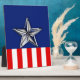 A chrome like large star design presented here on a patriotic style graphic print. Good for a patriotic occasion, sports event, or for a gift with an American flavour to it.