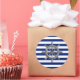 A silver chrome like wheel design on a navy blue stripes decor. A modern nautical gift.