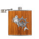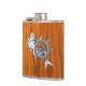 A modern nautical style silver chrome like applique on a teak wood print decor for a fine custom flask gift.