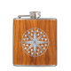 A modern nautical style silver chrome like applique on a teak wood print decor for a fine custom flask gift.