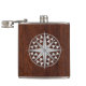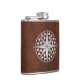 A modern nautical style silver chrome like applique on a wet mahogany wood print decor for a fine custom flask gift.