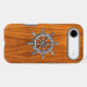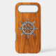 A modern nautical silver chrome like applique style on a teak wood grain decor for a custom phone case everyone on, or off the boat will enjoy.