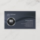 This simple elegant and professional pianist business card features a black background. A black hued wave streams from the left to the right, splitting the card into two sections. A circular chrome piano keys icon sits on this wave, on the left side of the card, while your name and title appear on the upper left and your business name and contact details appear on the bottom right. Designed for businesses or professions related to music, bass, bassist, bass guitarist, musician, band, entertainment, rock themes.