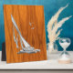 A silver chrome like regatta sailboat scene on a teak wood grain style background decor. A racy modern nautical gift.