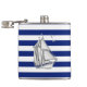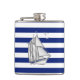 A modern nautical silver like applique style sailboat on a navy blue stripes pattern decor for a fine custom gift.
