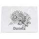 Black on white line art drawing of two Chrysanthemum flowers with a sprig of fern and a personalized name. This is original hand drawn art from Dogwood & Thistle Art and Design.
