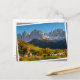 Photo postcard of the small village Sankt Magdalena with the prominent church surrounded by trees in autumn colours in front of high Dolomites mountain peaks in the last light of the day in the Villnöss (Funes) valley in South Tyrol, Italy with a white edge and the text 'Trentino'. The image is a bit rotated to create the illusion of it laying loose.