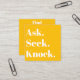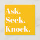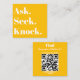 A unique orange and white square business card, designed to make a lasting impression. This minimalistic card features a rich orange and white colour scheme, perfectly complemented by an elegant serif typeface inspired by 19th-century European advertising posters. The front of the card boldly displays the powerful words, Ask. Seek. Knock. while the back encourages the recipient to find the promise of Matthew 7:7. With a customisable QR code, you have the opportunity to personalise a call to action above and below the code, making it ideal for promotional use for a sermon series or as a personal business card. Whether you're a minister or member of a church seeking to spread the message or an individual with a religious inclination, this card is a perfect fit. Share your faith and scripture in a stylish and impactful way. Embrace the power of this Christian-inspired business card today.