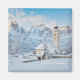 Photo magnet with the church of Colfosco covered in snow with in the background the Sella Group Dolomites mountains in a beautiful winter landscape in Alta Badia, South Tyrol, Italy with the text 'Alta Badia, Italy'.