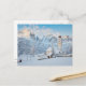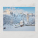 Church covered in snow with mountain background postcard