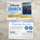 An attractive professional postcard that is a great fit for church events, but is generic enough to be for any event or conference. The front part has a faded sky background, with gold touches and ribbons throughout, and an editable square image on the front. All information is editable on the postcard, including the ticket information in the circles. Font colours can be changed in the Editor.
