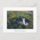 Postcard of a church surrounded by trees in a forest in fall colours on the hills around Bled Lake in Slovenia in autumn with a white border and the text: 'Slovenia'.