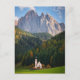 Photo postcard of the small church Sankt Johann in Ranui in front of the big Geisler Dolomites mountain peak and backed by a forest in fall colours in an autumn landscape in Villnöss, South Tyrol in Italy.