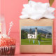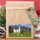 Rectangular photo sticker of the characteristic church of Seefeld village with the Alps mountains in the background. It is a holiday and ski resort in Tyrol in Austria.