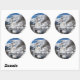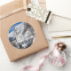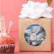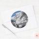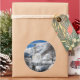 Round photo sticker with the famous St. Sebastian church in the snow backed by high Alps mountains with a bridge and a small brook in Ramsau b. Berchtesgaden, near Austria in Germany in winter.