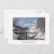 Photo postcard of a church under a layer of snow next to a mountain stream and a bridge with Alps mountains in the background in a winter landscape in Ramsau bei Berchtesgaden in the Berchtesgadener Land in Bavaria, southern Germany, near the border with Austria with a white border and the text 'Germany'.