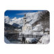 Rectangular photo magnet with the famous St. Sebastian church in the snow backed by high Alps mountains with a bridge and a small brook in Ramsau b. Berchtesgaden, near Austria in Germany in winter.