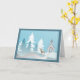 Illustrated holiday greeting card with church, trees , snow & a deer.