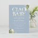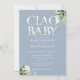 Ciao baby shower invitation featuring elegant, pretty botanical greenery foliage typography on a dusty blue background and your special photo on the reverse. Designed by Thisisnotme©