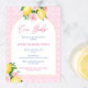 This modern baby shower invite design features a popular arch shape and lemons, with pink floral highlights against a pink and white background print made from a vintage tile.