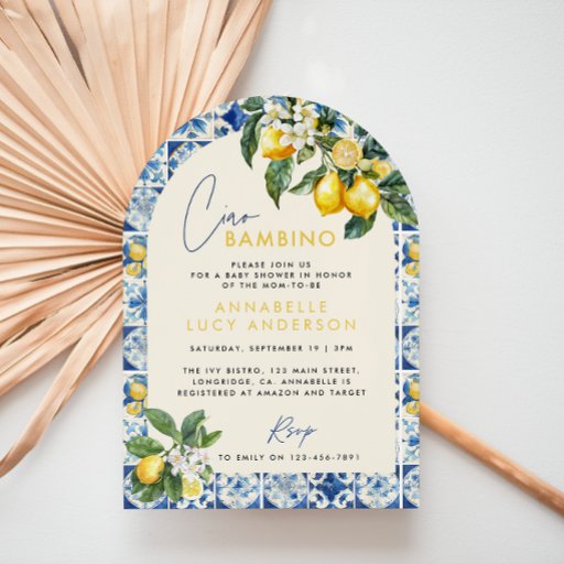 Ciao Bambino Baby Shower Invite. Greek, Greece, Santorini, Italian Bambino party attire t-shirt. Blue Tile Lemon olive Mediterranean theme. Download, downloadable Editable Template. Gender Neutral party design. Ideal gender neutral design. Perfect coordinating spring, summer autumn, fall winter baby shower design. Part of a collection