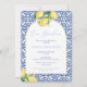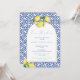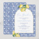 Ciao Bambino! Trendy watercolor lemons and glossy green leaves with a cobalt blue and white vintage tile design decorated this modern baby shower party invite to welcome a baby boy.
