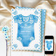 Cielito Lindo blue baby bodysuit boy baby shower Invitation. Celebrate the upcoming arrival of your little boy with this charming "Cielito Lindo" baby shower invitation. Inspired by traditional Mexican Talavera folk art, this invitation features a delightful illustration of a blue baby bodysuit adorned with delicate white flowers in a watercolor style. The bodysuit design is set against a clean white background with elegant scalloped edges. Imagine your guests' delight as they receive this beautiful invitation, giving them a lovely preview of the joyful celebration to come. The back of the invitation boasts a solid blue background, complementing the design and adding a touch of colour.