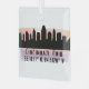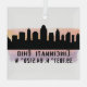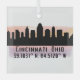 Glass ornament features skyline silhouette of Cincinnati, OH with map coordinates on a watercolor splash background,