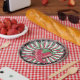 Fun party plates for for Cinco de Mayo and Mexican-themed events and parties with a distressed image of chilli peppers with red, green, and white stripes in the background.