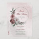Beautiful botanical save the date card featuring romantic pink, white and cinnamon rose/ chianti flowers with green leaves arranged on a circle to form a pretty wreath.
