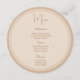 Menu Card is shown in the white basic matte paper in the circle shape with script and standard text in light brown.
