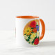 Mug in a detailed illustration of daisies and asters in bright shades of orange, yellow and red