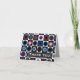 The design on this white glossy note card is a retro graphics pattern of equally sized and aligned square cells filled with solid circles and and with layered circles of varying colours. Marine Blue, Cranberry Red, black, white, and 2 shades of grey. Cover text and inside greeting can be personalised.