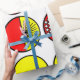 This wrapping paper has a mid-century modern design of half-circles, some with starbursts, some with small circles, and some just solid, in red and yellow.