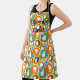 This apron has a mid-century modern design of circles and semi-circles in orange, yellow, green, brown, and turquoise on a field of white. If you want the same design with different colours, message me.